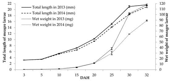 Total length and wet weight changes of meagre larvae (mm and mg, mean ± standard error (SE), n = 30) (0 to 15 days after hatching (DAH) = 364.8 °C, 16 to 32 DAH = 353.6 °C, Σ °C = 718.6 °C in 2013 and 0 to 15 DAH = 348.6 °C, 16–32 DAH = 353.6 °C, Σ°C = 702.2 °C in 2014).
