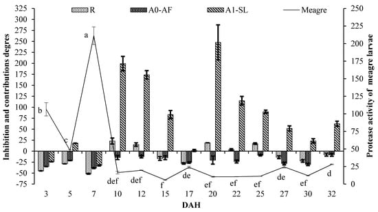 Protease activities of meagre larvae (U/mg protein, mean ± SE) (p < 0.05) and inhibitions and contributions of live foods on protease activities of meagre larvae in 2013 (%, mean ± SE). Line—larva protease and bar—live food inhibition and contributions.
