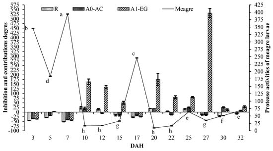 Protease activities of meagre larvae (U/mg protein, mean ± SE) (p < 0.05) and inhibitions and contributions of live foods on protease activities of meagre larvae in 2014 (%, mean ± SE). Line—larva protease and bar—live food inhibition and contributions.