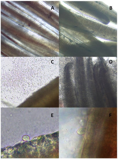Wet mount of white seabream (Diplodus sargus) gills from “Small” and “Big” experimental groups: (A) gill from Small treatment at 0 h (100×); (B) gill from Big treatment at 0 h (100×); (C) Small treatment at 5 h, presenting several Amyloodinium ocellatum dinospores near the gill (400×); (D) Big treatment at 24 h, presenting several A. ocellatum dinospores near the gill and a great amount of mucus (400×); and A. ocellatum trophonts in gill from Small treatment (E) and Big treatment (F) at 5 h of infestation.