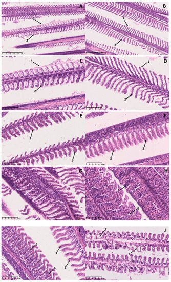 Histological section of hematoxylin–eosin (H&E) stained gills from white seabream (D. sargus) during an A. ocellatum infestation. (A) (100×) and (B) (200×) represent the Small and (C) (100×) and (D) (200×) represent the Big treatments at 0 h, with normal gills (1—primary lamella; 2—secondary lamella); (E) (200×) and (G) (200×) represent the Small and (F) (200×) and (H) (400×) represent the Big treatments at 5 h of infestation. A.-ocellatum-infested fish gills with several histopathological alterations: hyperplasia of the lamellar epithelium (3), vacuolization (4), mucus cells (5), and fusion of secondary lamellae (6); (I) (200×) and (J) (200×) images represent A.-ocellatum-infested fish gills of the Big treatment after 24 h of infestation, with several histopathological alterations: hyperplasia of the lamellar epithelium (3), fusion of secondary lamellae (6), and necrosis (7).