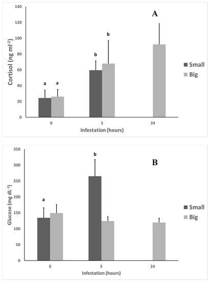 We can observe that there were significant differences (p < 0.05) in the cortisol levels between fish from 0 to 5 h after infestation in both treatments. The Big treatment also presented significant differences (p < 0.05) in glucose levels between 0 and 5 h after infestation.