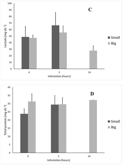 However, we observed statistical differences (p < 0.05) in white blood cell (WBC) values between treatments, with a lower percentage of WBC in the Small treatment. There were also statistical differences (p < 0.05) between 0 and 5 h after infestation in both treatments, with a decrease in the percentage of WBC over time.