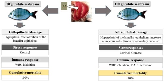 So, when A. ocellatum dinospores reached the gill and started the fixation and transformation into trophonts, both Small and Big white seabream began to present lesions in gill tissue which increased over time. However, these were more severe in the Small treatment, possibly due to the nonactivation of the MALT defense system, which was present in the Big treatment (increase in gill mucus cells). This triggered a primary stress response in both treatments (cortisol), with a secondary stress response (glucose) in the Big treatment. However, the absence of glucose and lactate response in the Small treatment indicates a possible inhibition of the glycogenolysis and gluconeogenesis pathways in the liver in the Small treatment. The primary stress response to A. ocellatum also inhibited the WBC immune response in both treatments. These differences in the response to an A. ocellatum outbreak by the Small and Big treatments may explain the differences in mortality 24 h after infestation.