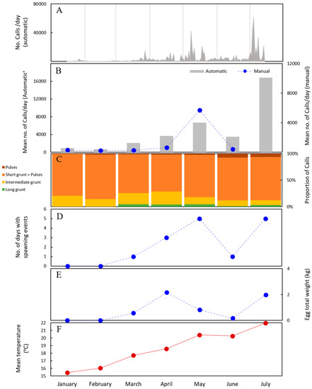 Seasonal variation of (A) the number of calls per day, (B) the mean number of calls per month, (C) the proportion of sound categories identified by the automatic recognition system, (D) the number of days with spawning events per month, (E) the eggs’ total weight and (F) mean water temperature per month. A total of 7492 calls were counted and categorized manually from 3-h recordings, between 18:00 and 21:00, in two days per month, from January to June 2018. The values obtained with the automatic recognition system represent monthly means of the calls counted on the full round-the-clock recordings. Notice that in (A) the horizontal axis is a continuous scale of days at each month. In addition, note that spawning (D and E) occurs in discrete events.