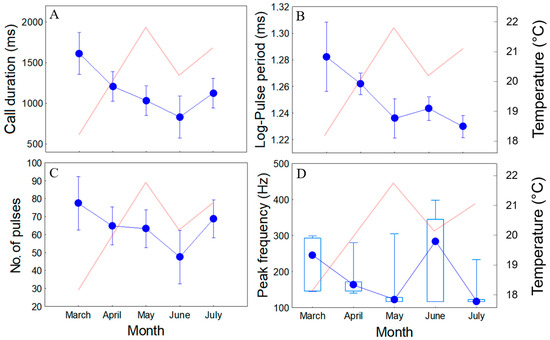 Seasonal variation of (A) sound duration (ms), (B) pulse period (ms), (C) number of pulses and (D) peak frequency (Hz) of long grunts (10 to 20 calls were considered per month). In (A–C) mean and 95% confidence intervals are shown. In the case of pulse periods, the mean and confidence intervals were computed for covariate at their mean (20.5 °C). In (D) median, quartiles and range are shown. In red, water temperature variation (mean values on the selected days, ˚C).