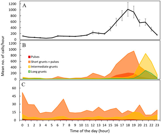 Mean call rates varied with time of day, with call rates peaking near sunset period and dropping off before midnight (Figure 4A). Interestingly, preliminary visualization of calling activity suggested at least two types of rhythms, depending on the overall daily number of calls. Thus, days were ranked by the number of calls counted per day and classified in percentiles. On the days with lower acoustic activity (25th percentile) and no chorusing behaviour, calls were more evenly produced throughout the 24 h cycle (Figure 4C). When the acoustic activity increased (75th percentile), the call rates peaking between 15:00 and midnight were clearly pronounced, reaching a mean calling rate of 1480 calls/hour at 21:00 (Figure 4B). Furthermore, the longer sound categories seem to appear later in the night (Figure 4B). Note that the distinction of sound categories depicted in Figure 3 was obtained by the automatic recognition system, and, as mentioned above, it recognised a high proportion of pulse calls as short grunts.