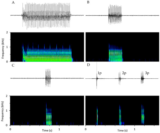 Oscillograms and spectrograms representing meagre’s acoustic repertoire: (A) Long grunts (30–135 pulses), (B) intermediate grunts (7–29 pulses), (C) short grunts (4–6pulses) and (D) 1, 2 and 3 pulses. Sampling frequency 12 kHz, 1024 point FFT, 98 points window, Hamming window, and 50% overlap.