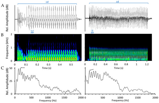 (A) Oscillograms, (B) spectrograms and (C) power spectra of two Argyrosomus regius male breeding calls, representing some of the measured acoustic parameters: (pp) Pulse period and (cd) call duration in (A), and peak frequency (arrow) in (C). Sampling frequency 12 kHz, 1024 point FFT, 98 points window, Hamming window and 50% overlap. Note differences in call duration and power spectra between calls. The call on the left also shows variability in pulse rate and amplitude modulation.