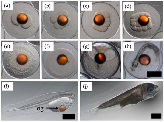Development of second filial generation (F2) hāpuku (Polyprion oxygeneios) incubated at 13.5 °C. Gametes were collected by strip-spawning and fertilized in vitro. (a) Two-cell stage (~3.5 h post-fertilization); (b) four-cell stage (~4.5 h post-fertilization); (c) eight-cell stage (~5.5 h post-fertilization); (d) 16-cell stage (~6.5 h post-fertilization); (e) blastula (~14 h post-fertilization); (f) gastrula (36 h post-fertilization); (g) neurula (51 h post-fertilization); (h) tail-free embryo (108 h post-fertilization); (i) 2 day old larva; (j) 20 day old larva. Scale bar = 1 mm. Abbreviations: og = oil globule.