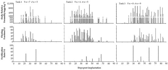Trial 2A, GnRHa-treated tanks only: Spawning performance of first filial (F1) hāpuku (Polyprion oxygeneios) maintained on an annually cycling thermal regime that varied from cool temperatures in the winter months (10.0–12.5 °C) to warmer temperatures (17 °C) in the summer months prior to being held at 13.5 °C for the spawning season. Each tank contained GnRHa implanted females (n = 21 distributed amongst three tanks; target dose of 100 µg/kg−1; achieved dose 79–139 µg/kg−1) and males (n = 19 distributed amongst three tanks; target dose of 50 µg/kg−1; achieved dose 49–76 µg/kg−1). The number of fish in each tank is shown on the figures. Data are shown as estimates of daily relative fecundity (number of eggs produced per kg−1 of mean body weight of the females in each tank), the percentage of floating eggs and the percentage of fertilized eggs from each spawning event. Striped and blank bars represent batches of eggs where fertilization was detected or absent, respectively. Blank-implanted fish were housed separately (n = 3 tanks) from GnRHa-implanted fish. No eggs were detected from blank-treated fish.