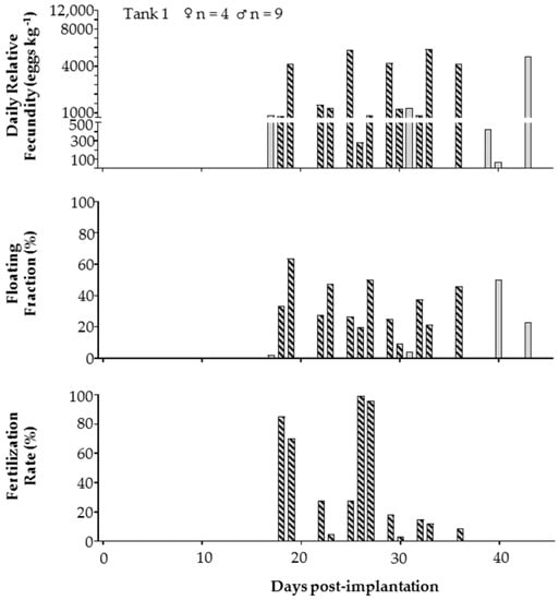 Trial 2B, high dose tank only: Spawning performance of first filial (F1) hāpuku (Polyprion oxygeneios) maintained on an annually cycling regime from cool temperatures in the winter months (10.0–12.5 °C) to warmer temperatures (17 °C) in the summer months prior to being held at 13.5 °C for the spawning season. Females were administered 1 mg GnRHa implants (high dose) (n = 5; target dose of 100 µg/kg−1; achieved dose 95–145 µg/kg−1) and males were administered implants containing a dose of 0.5 mg GnRHa (n = 9; target dose of 50 µg/kg−1; achieved dose 38–53 µg/kg−1). Data are shown as estimates of daily relative fecundity (number of eggs produced per kg−1 of mean body weight of the females in each tank), the percentage of floating eggs and the percentage of fertilized eggs from each spawning event. Striped and blank bars represent batches of eggs where fertilization was detected or absent, respectively. No eggs were detected from the tank containing low-dose treated fish.