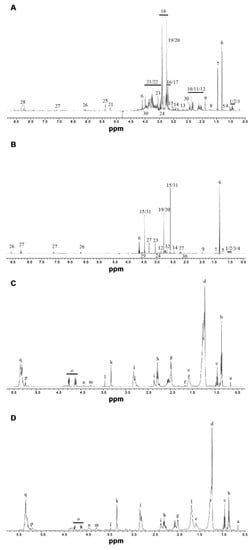 One-dimensional 1H-NMR analysis of the aqueous phase using zgesgp pulse sequence (Bruker BioSpin GmbH, Rheinstetten, Germany) was performed at 25 °C with 128 scans and 65,536 data points over a spectral width of 17,942.58 Hz. Acquisition time was 1.83 s and relaxation delay was 4.0 s. Two-dimensional correlation spectroscopy (COSY) and total correlation spectroscopy (TOCSY) with pre-saturation were performed with 32 scans and a spectral width of 7195 Hz for both F1 and F2. The mixing time for TOCSY was 80 ms. Heteronuclear single quantum correlation (HSQC) was performed using 32 scans and a spectral width of 7211 Hz and 25,002.09 Hz for proton and carbon, respectively. For the identification of signals a standard pulse sequence from the Bruker library was used. The 1H NMR spectra of the chloroform phase were recorded using zg30 pulse sequence (Bruker BioSpin GmbH, Rheinstetten, Germany) at 20 °C with 128 scans and 65,536 data points over a spectral width of 12,019.23 Hz. The acquisition time was 2.72 s and the relaxation delay 3 s.