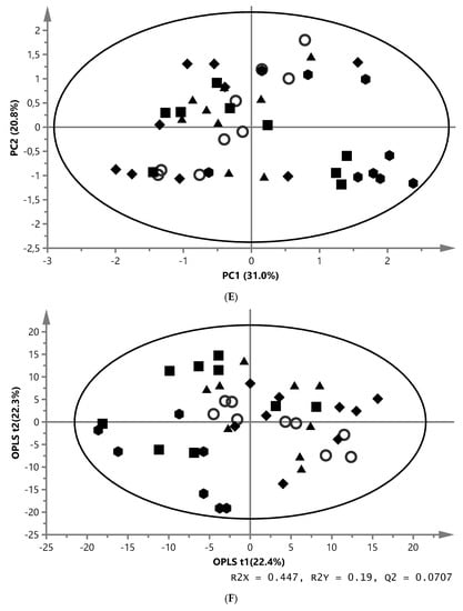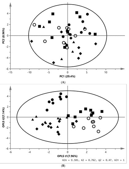 - Eriksson, L.; Trygg, J.; Wold, S. CV-ANOVA for significance testing of PLS and OPLS (R) models. J. Chemom. 2008, 22, 594–600. [Google Scholar] [CrossRef]