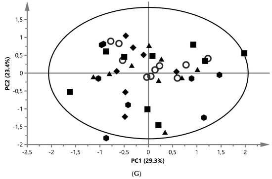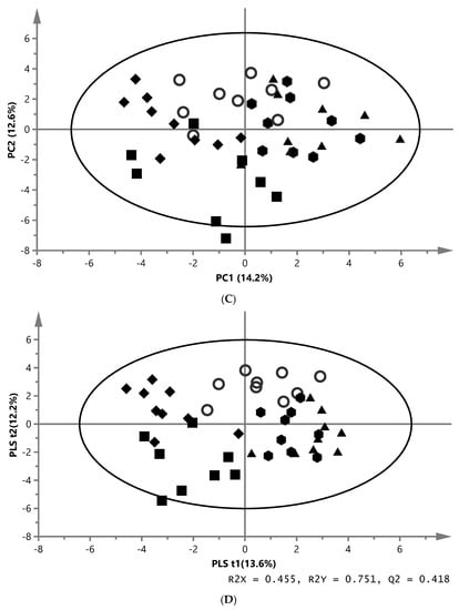 A representative 1H NMR spectrum showing the metabolic profile of white muscle chloroform extract is shown in Figure 1D. Multivariate data analysis gave analogous results to those obtained for extracts from the hepatic chloroform phase. The first and second principal components explained 29.3% and 23.4%, respectively, of spectral variation (R2X) in the PCA model (model parameters: R2X = 94.1% and Q2 = 70.8%) after removing three outliers (2xWY and 1xZYG) (Figure 2G). Overall, there was no clear clustering separation between the REF and the other four diets. Further investigations with the PLS-DA and OPLS-DA models showed no significant differences between the REF and four experimental groups in terms of their R2Y, Q2Y, and CV-ANOVA (p > 0.05). Therefore, no further data analysis was performed.