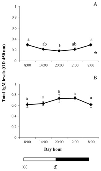 indicate lights on and off, respectively. Results are expressed as mean ± standard error of the mean (SEM) (n = 6). Different letters denote variations in the IgM levels at the sampling times (ANOVA), and the asterisk indicates a significant rhythmic pattern over 24 h (Ritme©). The levels of significance were set at p < 0.05. Letters shared in common among experimental times indicate no significant differences.