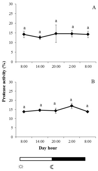 indicate lights on and off, respectively. Results are expressed as mean ± SEM (n = 6). Different letters denote variations in the protease activity at the sampling times (ANOVA). The levels of significance were set at p < 0.05. Letters shared in common among experimental times indicate no significant differences.