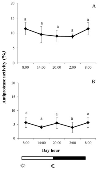 indicate lights on and off, respectively. Results are expressed as mean ± SEM (n = 6). Different letters denote variations in the antiprotease activity at the sampling times (ANOVA). The levels of significance were set at p < 0.05. Letters shared in common among experimental times indicate no significant differences.