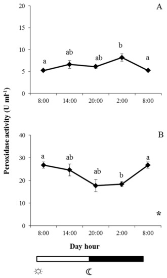 indicate lights on and off, respectively. Results are expressed as mean ± SEM (n = 6). Different letters denote variations in the peroxidase activity at the sampling times (ANOVA), and the asterisk indicates a significant rhythmic pattern over 24 h (Ritme©). The levels of significance were set at p < 0.05. Letters shared in common among experimental times indicate no significant differences.