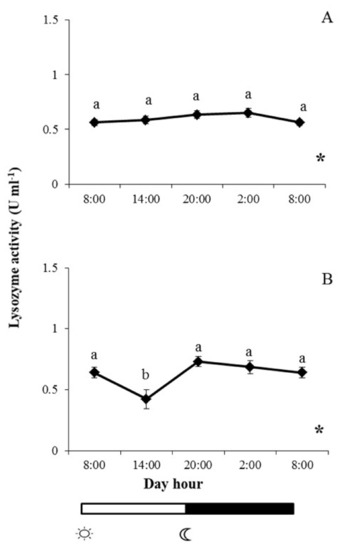 indicate lights on and off, respectively. Results are expressed as mean ± SEM (n = 6). Different letters denote variations in the lysozyme activity at the sampling times (ANOVA), and the asterisk indicates a significant rhythmic pattern over 24 h (Ritme©). The levels of significance were set at p < 0.05. Letters shared in common among experimental times indicate no significant differences.