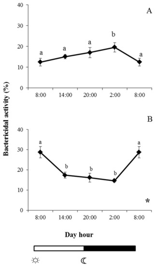 indicate lights on and off, respectively. Different letters denote variations in the bactericidal activity at the sampling times (ANOVA), and the asterisk indicates a significant rhythmic pattern over 24 h (Ritme©). The levels of significance were set at p < 0.05. Letters shared in common among experimental times indicate no significant differences.