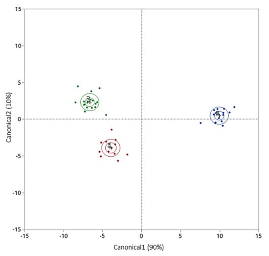 The factors included in the LDA model were selected by a stepwise backward approach. Thus, we employed in the model such variables associated with a p < 0.05 by means of analysis of covariance among all the variables. Sixteen fatty acids were selected and included in the arrangement of the discriminant model, allowing 100% of cases in the training set to be correctly grouped. The variables that highly correlated with Canonical1 (correlation loading |>0.5|) were represented by EPA, PUFA, OA, MUFA, 14:0 and ARA, whereas the highest correlation loadings (|>0.5|) between the variables and Canonical2 were associated with 20:1 n9, DHA, LA, DPA and 14:0. As shown in Figure 1 and Table 3, a suitable group separation was obtained in the bi-plot determined by the two canonicals, C1 and C2 (p < 0.01). Particularly, Siberian sturgeon eggs and caviar samples (red dots) were characterized by negative values for both C1 and C2, Russian sturgeon eggs and caviar samples (green dots) were characterized by positive values for C1 and negative values for C2, and White sturgeon eggs and caviar samples (blue dots) were characterized by positive values for both C1 and C2.