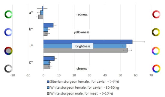 We evaluated the colorimetric features of collected sturgeon fillets. Results of colorimetric analysis (redness, a*, yellowness, b*, lightness, L* and Chroma, C*) are shown in Table 7 and Figure 2.