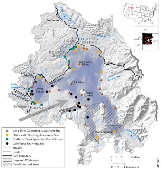 - Trout Unlimited. Science Supporting Management of Yellowstone Lake Fisheries: Responses to Frequently Asked Questions; Wyoming Water Project, Trout Unlimited: Lander, WY, USA, 2014; Available online: http://wyomingtu.org/wp-content/uploads/2014/03/Science-Supporting-Management-of-Yellowstone-Lake-Fisheries.pdf (accessed on 10 June 2020).