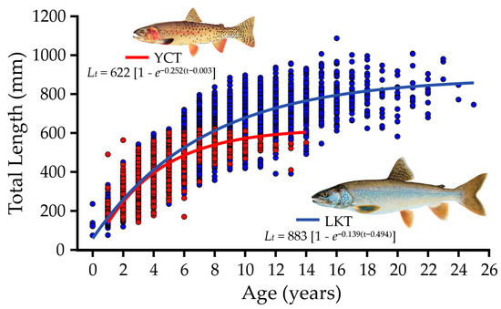 - Kaeding, L.R.; Koel, T.M. Age, growth, maturity, and fecundity of Yellowstone Lake cutthroat trout. Northwest Sci. 2011, 85, 431–444. [Google Scholar] [CrossRef]