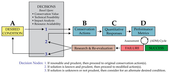 Adaptive management (ADM) strategy conceptual model for Yellowstone Lake ecosystem restoration. Desired condition (A), conservation actions (B), quantitative responses (C), and performance metrics (D) are defined in the text and listed in Table 1 [90].