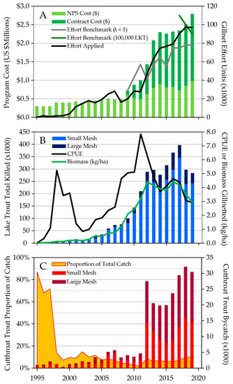 Costs, effort, and catch of the Yellowstone Lake ecosystem restoration program, 1995–2019, including (A) the total program cost (US $Millions) of National Park Service (NPS) and contracted operations, gillnetting effort unit (100-m net nights) benchmarks estimated by statistical-catch-at-age modeling to achieve λ < 1 (2009–2019) or to reduce lake trout (LKT) total abundance to 100,000 fish (2017–2019), and the actual total annual gillnetting effort applied, (B) total numbers of lake trout killed by small and large mesh gillnets, catch-per-unit-effort (CPUE) by all mesh sizes combined, and total biomass of lake trout gillnetted, and (C) cutthroat trout proportion (%) of total gillnet catch and number of bycatch in small and large mesh gillnets.