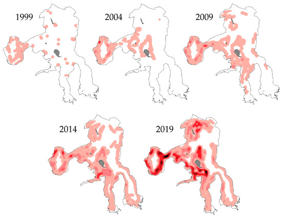 Spatial expansion and increase in intensity of suppression gillnetting effort on Yellowstone Lake during years of rapid lake trout population growth (1999, 2004, and 2009) and years where distribution of gillnets and overall effort was great enough to curtail population growth (i.e., λ < 1; 2014 and 2019). Darker shades of red indicate lake areas with greater intensity of gillnetting effort.