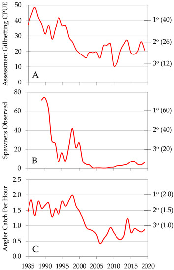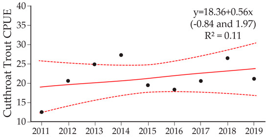 Primary, secondary, and tertiary desired conditions for the Yellowstone Lake ecosystem were described in the Native Fish Conservation Plan (Table 1) [90]. Complete eradication of lake trout, the most significant agent of change, was the primary desired condition for Yellowstone Lake. However, the secondary condition was initially set as the management target because available lake trout suppression methods were incapable of achieving the primary desired condition. The tertiary condition would become the management target if implementation of conservation actions did not achieve the secondary desired condition. Failure to achieve at least the tertiary condition would be considered a failure to meet the objectives of the plan. Although cutthroat trout are expected to naturally recover following lake trout decline, conservation actions of all desired conditions included ensuring spawning tributary connectivity to Yellowstone Lake during drought years [51,90,92] and reintroduction (stocking) of cutthroat trout to tributaries lacking use by spawners if deemed necessary to maintain the tertiary desired condition.
