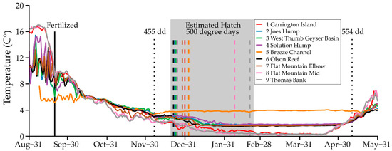 - Dwyer, W.P. Effect of lowering water temperature on hatching time and survival of lake trout eggs. Prog. Fish-Cult. 1987, 49, 175–176. [Google Scholar] [CrossRef]