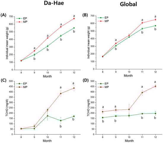 | Final mean weight (g fish−1) | 551.0 ± 10.9 b | 674.9 ± 8.3 a | 570.5 ± 4.4 b | 651.4 ± 19.9 a | |