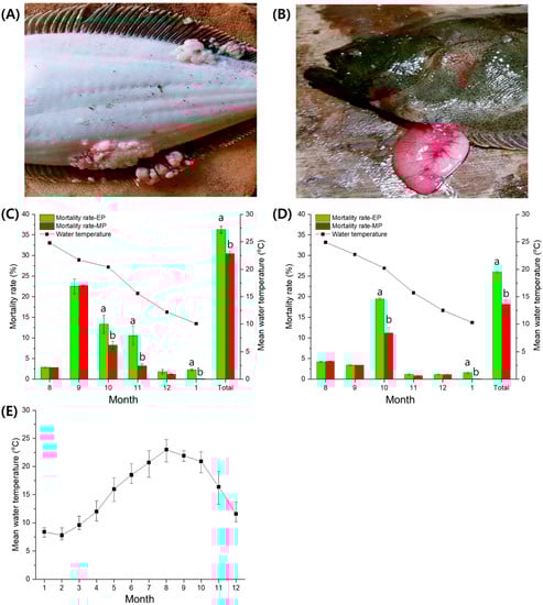 - Kim, S.M.; Jun, L.J.; Park, M.A.; Jung, S.H.; Jeong, H.D.; Jeong, J.B. Monitoring of Emaciation Disease in Cultured Olive Flounder Paralichthys olivaceus in Jeju (2010–2013), Korea. Korean J. Fish. Aquat. Sci. 2015, 48, 719–724. [Google Scholar] [CrossRef][Green Version]