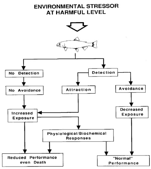 - Tierney, K.B. Chemical Avoidance Responses of Fishes. Aquat. Toxicol. 2016, 174, 228–241. [Google Scholar] [CrossRef]