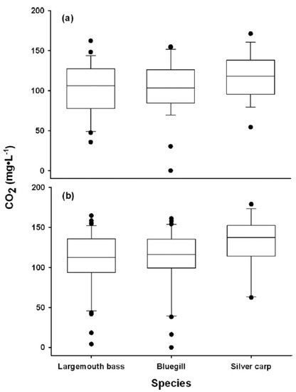 - Suski, C.D.; Philipp, M.A.; Hasler, C.T. Influence of Nutritional Status on Carbon Dioxide Tolerance and Avoidance Behavior in a Freshwater Teleost. Trans. Am. Fish. Soc. 2019, 148, 914–925. [Google Scholar] [CrossRef]