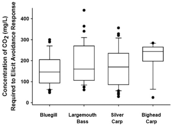 - Kates, D.; Dennis, C.; Noatch, M.R.; Suski, C.D. Responses of Native and Invasive Fishes to Carbon Dioxide: Potential for a Nonphysical Barrier to Fish Dispersal. Can. J. Fish. Aquat. Sci. 2012, 69, 1748–1759. [Google Scholar] [CrossRef]