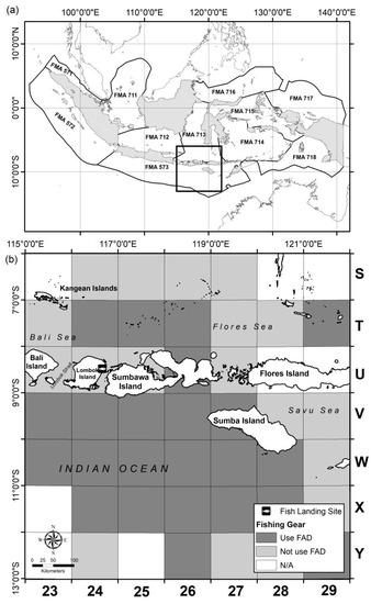 - MMAF. Tuna Fisheries Management Plan; Ministry of Marine Affairs and Fisheries: Jakarta, Indonesia, 2015. [Google Scholar]
