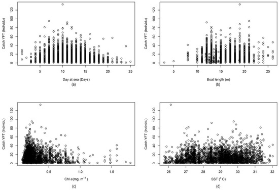 | Year | Catch of YFT (Individual) | Trip Duration (Days) | Length of Boat (m) | SST (°C) | Chl a (mg m−3) |