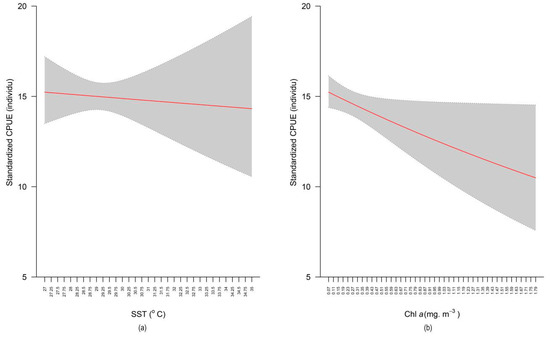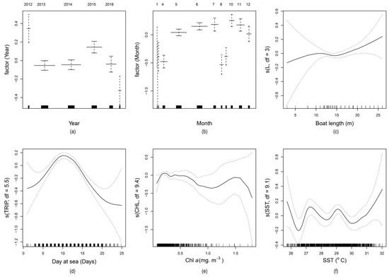 - CPUE~Year + month + s (boat length) + s (days at sea) + s (Chl a) + s(SST)… fitted with a Generalized Additive Model (GAM) using a smoothing function (s(x)) [44].