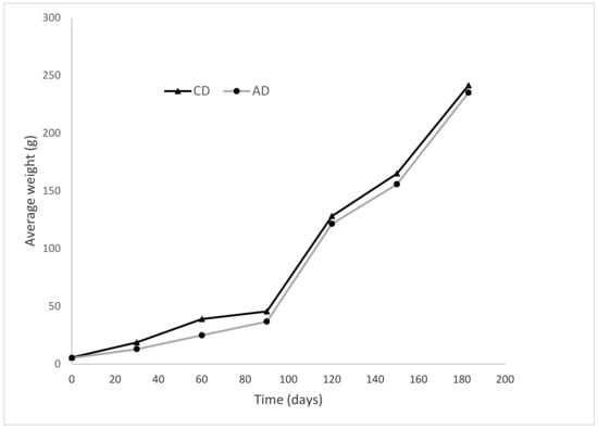 Despite a lower feed intake by the fish fed the AD diet, the overall growth was similar to the fish fed the control diet (CD). The lower feed intake corresponds to a relatively lower growth of fish in the first 100 days, when AD was fed to fish in the IAA regime. This is seen in the growth curve (