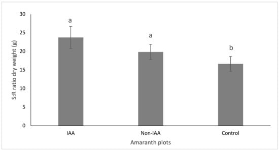 44]. This was also found in the present study, where IAA and non-IAA plots had significantly higher S:R ratio than the control plots. This may be attributed to a sufficient supply of nutrients for the IAA plots from the fish-pond water, and for the non-IAA plots from the chemical fertilizers.