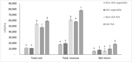 49]. The IAA and non-IAA plots had comparable revenues and net returns, despite that no chemical fertilizers were applied to the IAA plots. This implies that, the use of pond water (regarded as of zero cost) sufficiently covered for chemical fertilizer, which were applied in the non-IAA plots.