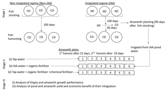 33], there is no clear information on the use of these by-products for improvements of the farm productivity and the farmer’s income. In the light of the above background, the present study aimed at using amaranth waste (AW) as an ingredient in feed for tilapia, and use pond water for irrigating amaranth plots in a tilapia-amaranth integration, as a way to improve the overall farm productivity and the economic return. The use of AW was also regarded as a way to recycle wastes, thus providing additional ecological benefits.