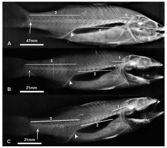 X-ray of (A) adult European seabass with 24 vertebrae, (B) juvenile European seabass with 25 vertebrae and (C) juvenile European seabass with 26 vertebrae. Note: 1 is cervical region, 2 is abdominal region and 3 is caudal region. The arrowhead shows the interhaemal bone and the arrow shows the 24th vertebra. Individuals with different vertebrae numbers (24, 25 and 26 vertebrae) but within the same age group had similar mean total lengths (p > 0.05).