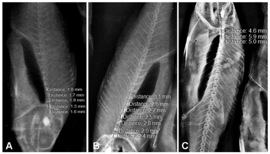X-rays and vertebrae length measurements of (A) fingerling European seabass, (B) juvenile European seabass and (C) adult European seabass. Note: The mean lengths of the 24th vertebra (for individuals with 24, 25 and 26 vertebrae) for individuals within the same age group were similar (p > 0.05).