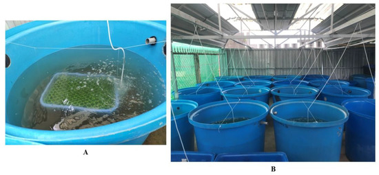 The experimental system was set up under a transparent roof with a natural photoperiod. Shrimp juveniles with an initial weight of 0.37 ± 0.06 g were reared in 500 L plastic tanks filled with 300 L of seawater (30 g L−1) and provided with continuous aeration. Sea grape thalli were spread over a 0.24 m2 rectangular perforated tray (0.4 m × 0.6 m × 0.1 m), covered with a large mesh-sized plastic sheet to fix them in the culture tray, and then each culture tray was hung in a shrimp tank about 20 cm from the tank bottom (Figure 1).