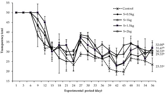 The fluctuation of water transparency in rearing tanks during the culture period. The error bars stand for the mean values and standard deviation. The different superscripts a, b illustrates the statistical difference in water transparency among the treatments.